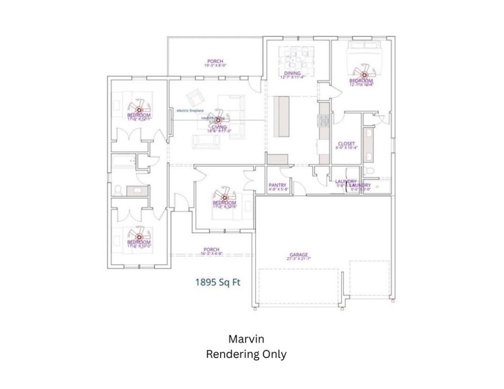 Experience the Marvin plan at Spring Creek Farms. This modern community will feature a community pool, playground and walking trails. The Marvin Plan offers refined single-level living with a thoughtfully designed 4-bedroom, 2 bath layout that blends comfort and sophistication. The open-concept design is enhanced by soaring vaulted ceilings accented with beams, and electric fireplace. The kitchen is beautifully appointed with custom soft-close cabinetry extending to the ceiling, a gas range, fully vented hood, and built-in microwave?perfectly balancing style and functionality. The primary suite is a serene private retreat, featuring a a tray ceiling in the bedroom and a luxurious walk-in shower for a true spa-like escape. A 3-car garage and a large covered patio with gas and ethernet hookups complete this thoughtfully crafted luxury design